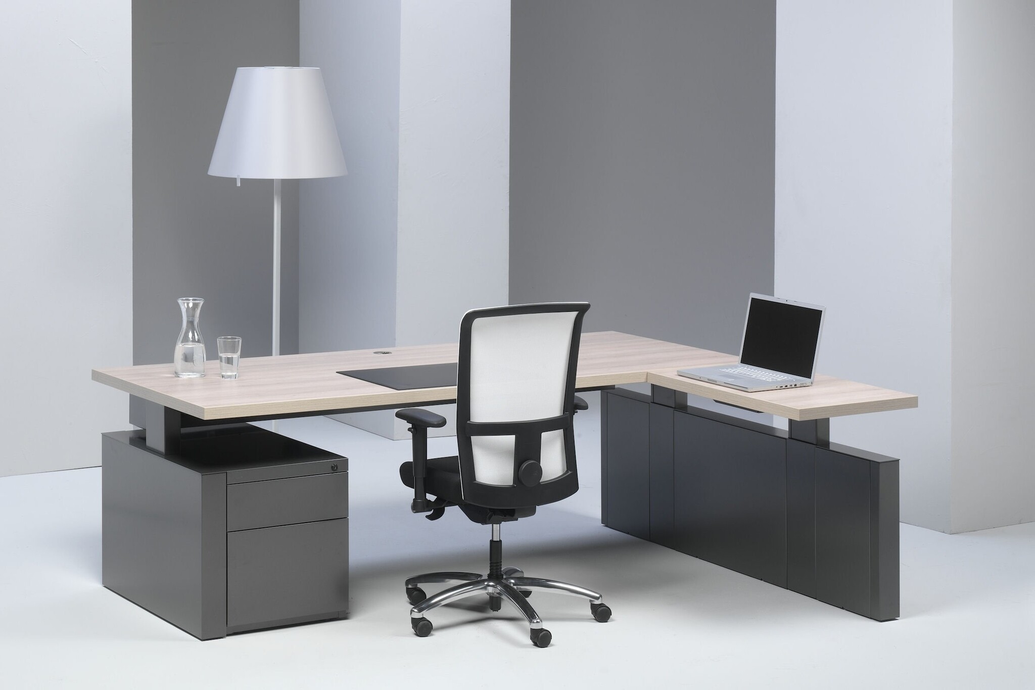 Het Voortman Cheek to Cheek bureau wordt standaard uitgevoerd met een 40 mm werkblad en is afgewerkt met HPL (high pressure laminate) bovenzijde en een backingboard onderzijde.