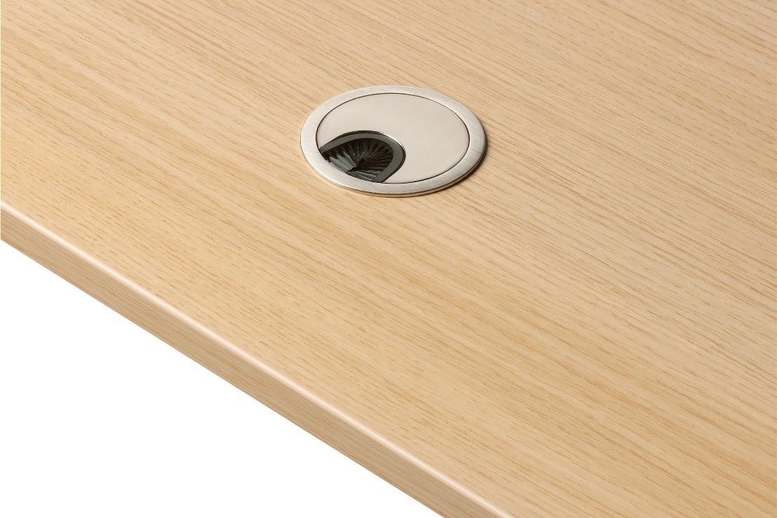 Kabels zijn mooi weggewerkt met de kabelgoot onder het bureau en via de kabeldoorvoer in het bureau.