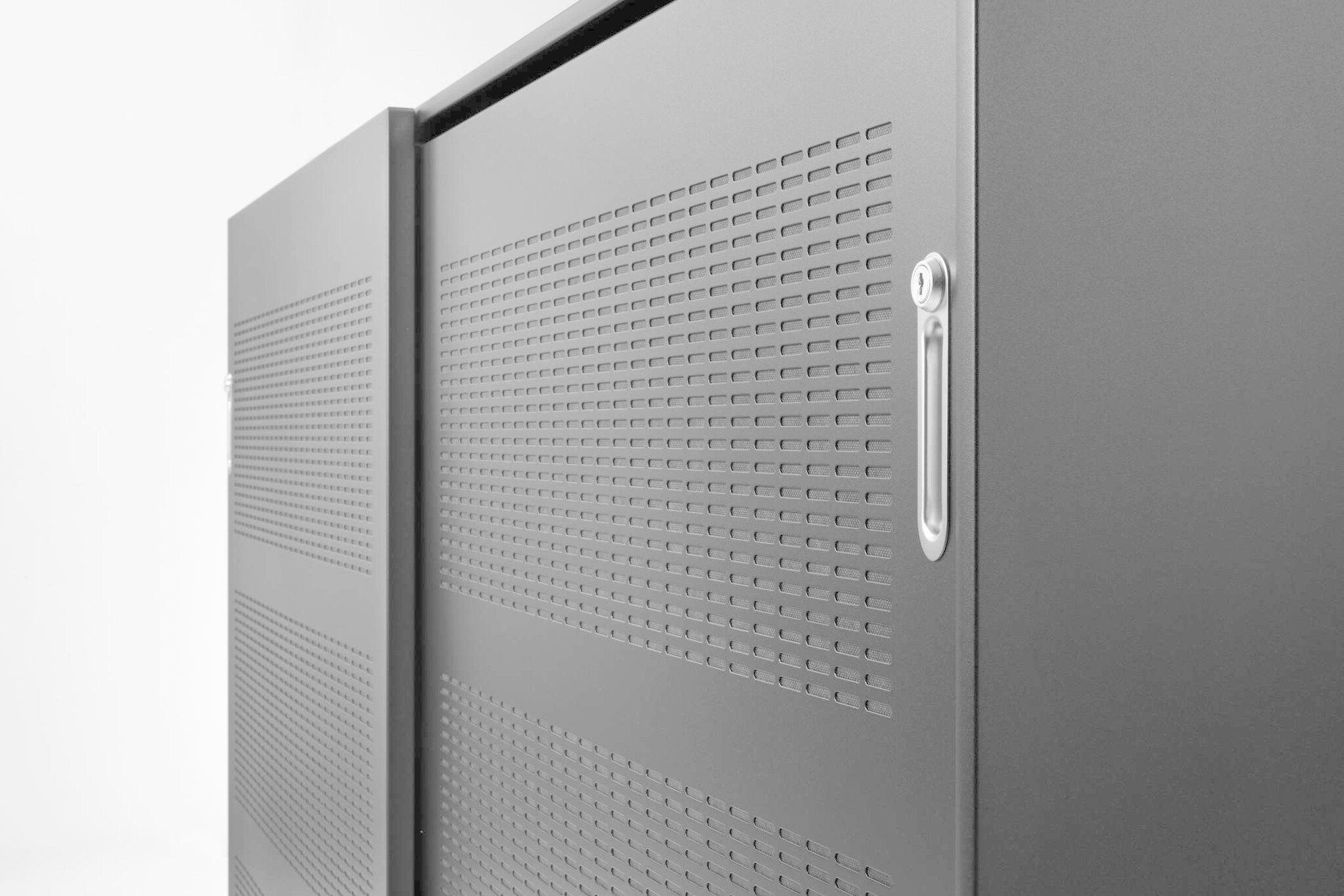 De akoestische schuifdeurkast heeft een zeer degelijke constructie, bestaande uit een gelaste romp, en twee schuifdeuren opgehangen in een railsysteem met wielgeleiding. De rechter deur is voorzien van een doorlopende handgreep, de schuifdeuren zijn voorzien van een rechthoekig perforatiepatroon.