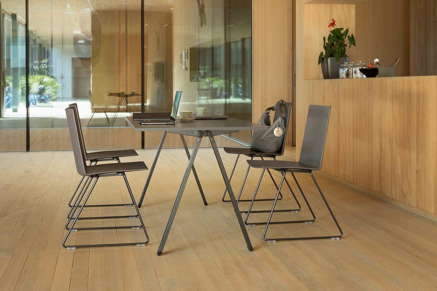 De stoel is standaard voorzien van kunststof glijders voor zachter ondervloeren, zoals projecttapijt. Optioneel zijn vilten glijders, tegen een meerprijs, te leveren voor een harde vloer, zoals hout. Kies de juiste glijders, zodat de stoelen eenvoudig over de vloer glijden.