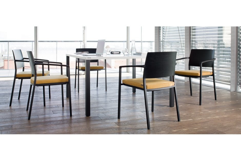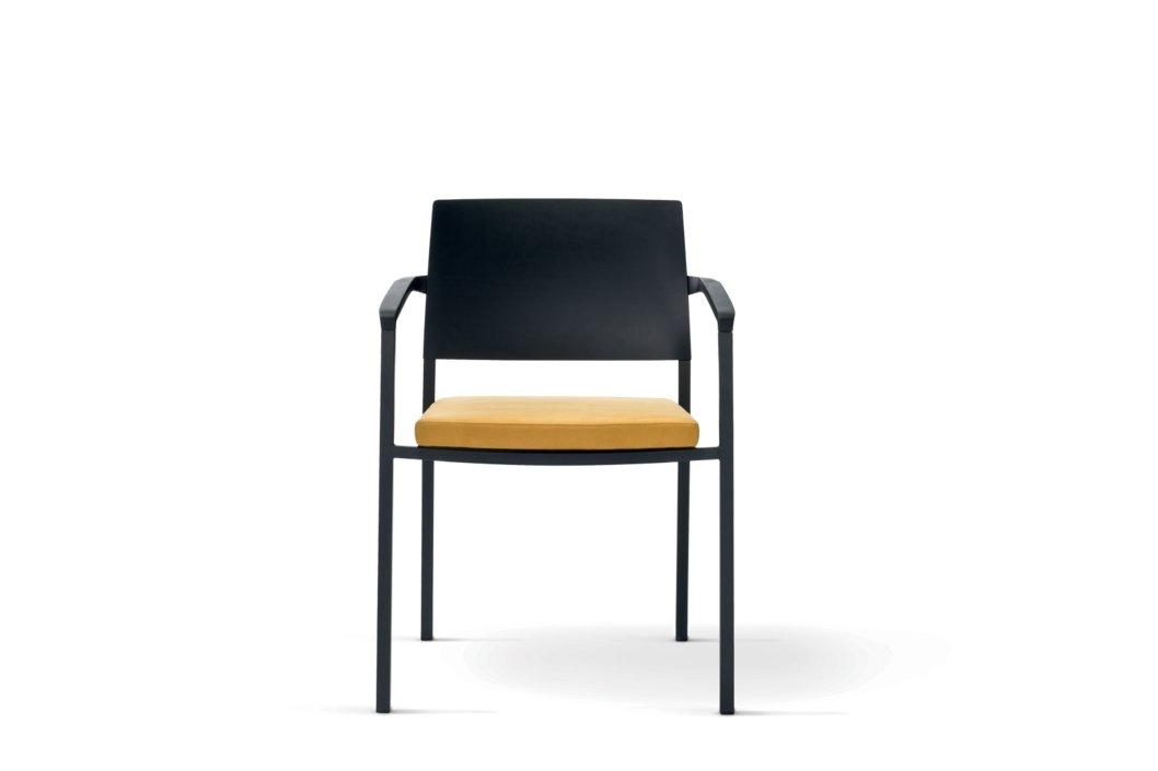 Frame van stalen precisiebuis, kunststof glijders. Zitting met elastische bespanning. Stapelschaal kunststof zwart. Massief houten armleggers, naar keuze beuken, essen of eiken. Houten oppervlakken gebeitst, metalen oppervlakken met poedercoating.