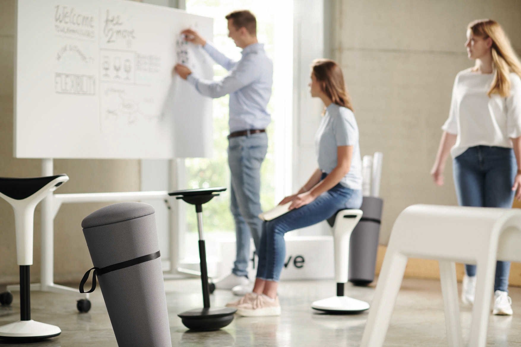 Deze compacte kruk is vervolgens na gebruik weer makkelijk op te bergen in bijvoorbeeld een hoek in de vergaderruimte. Klaar voor de volgende (iets te lange) vergadering.