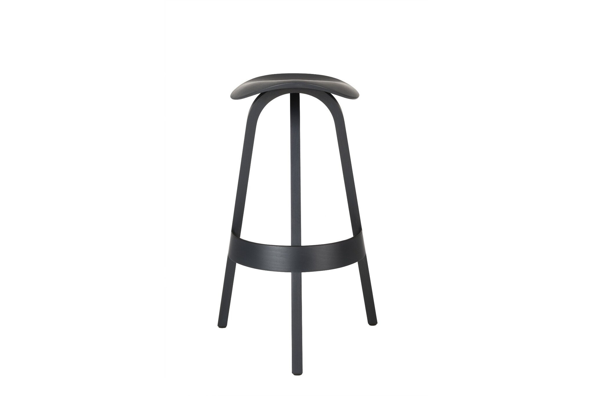 Thonet 404 H houten Thonet barkruk met 3-poots onderstel. Frame beuken gelamineerd, voetsteun voorzien van zwarte rubberen beschermstrip. Uitvoering gebeitst of gelakt beuken. Zithoogte 77 cm.